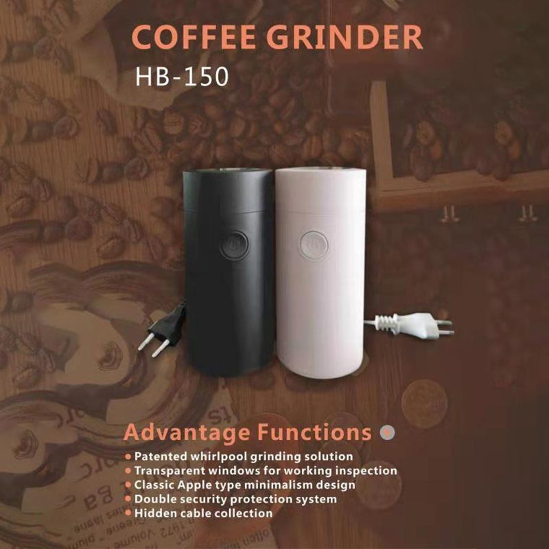NINGBO HUBO 공장 50g 용량의 전기 커피 그라인더는 연삭 시스템에 150W 전력을 제공할 수 있는 고속 모든 구리 모터를 기반으로 고품질 스테인레스 스틸 플랫 블레이드 연삭 시스템을 사용하여 플랫 블레이드가 최소 22000RPM에 도달하도록 합니다. 커피콩을 자르세요. 50g의 커피콩을 갈아주는 데 30초만 소요됩니다. 스테인리스 스틸 전기 커피 그라인더에서 신선한 커피 가루를 만드세요.